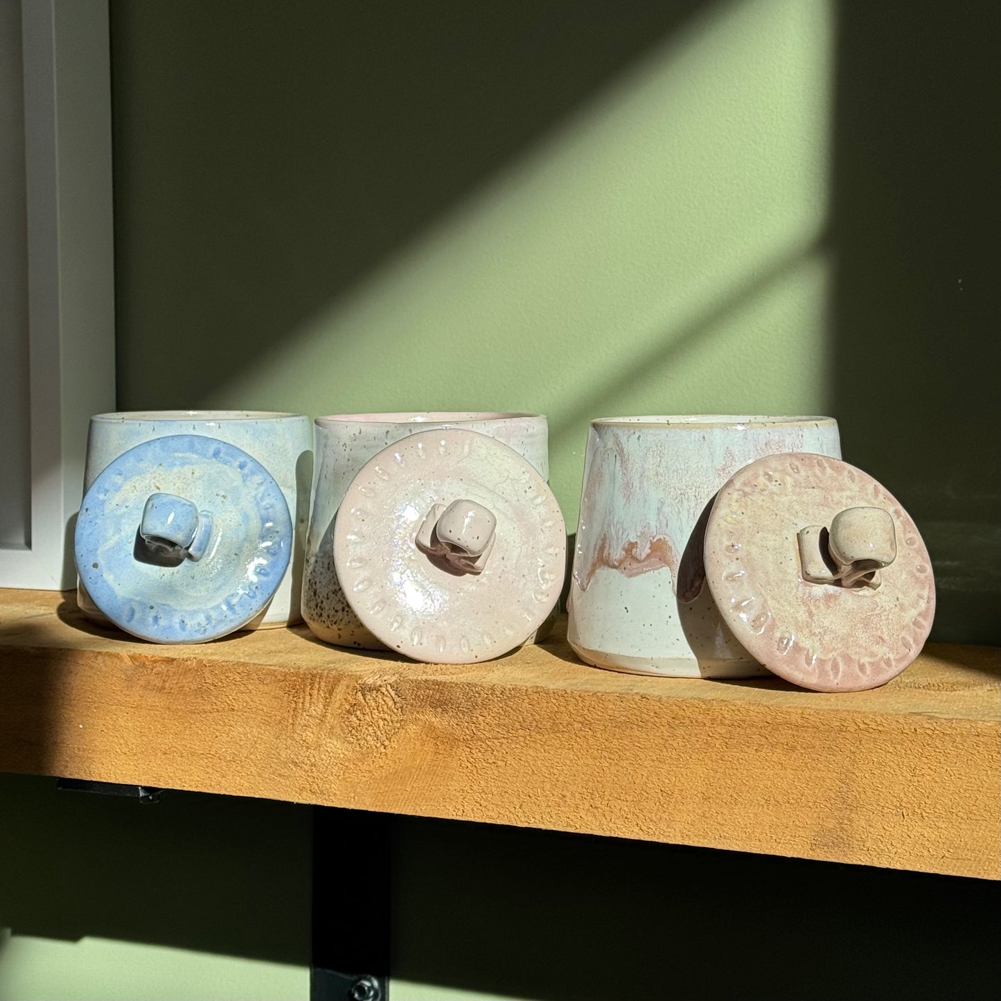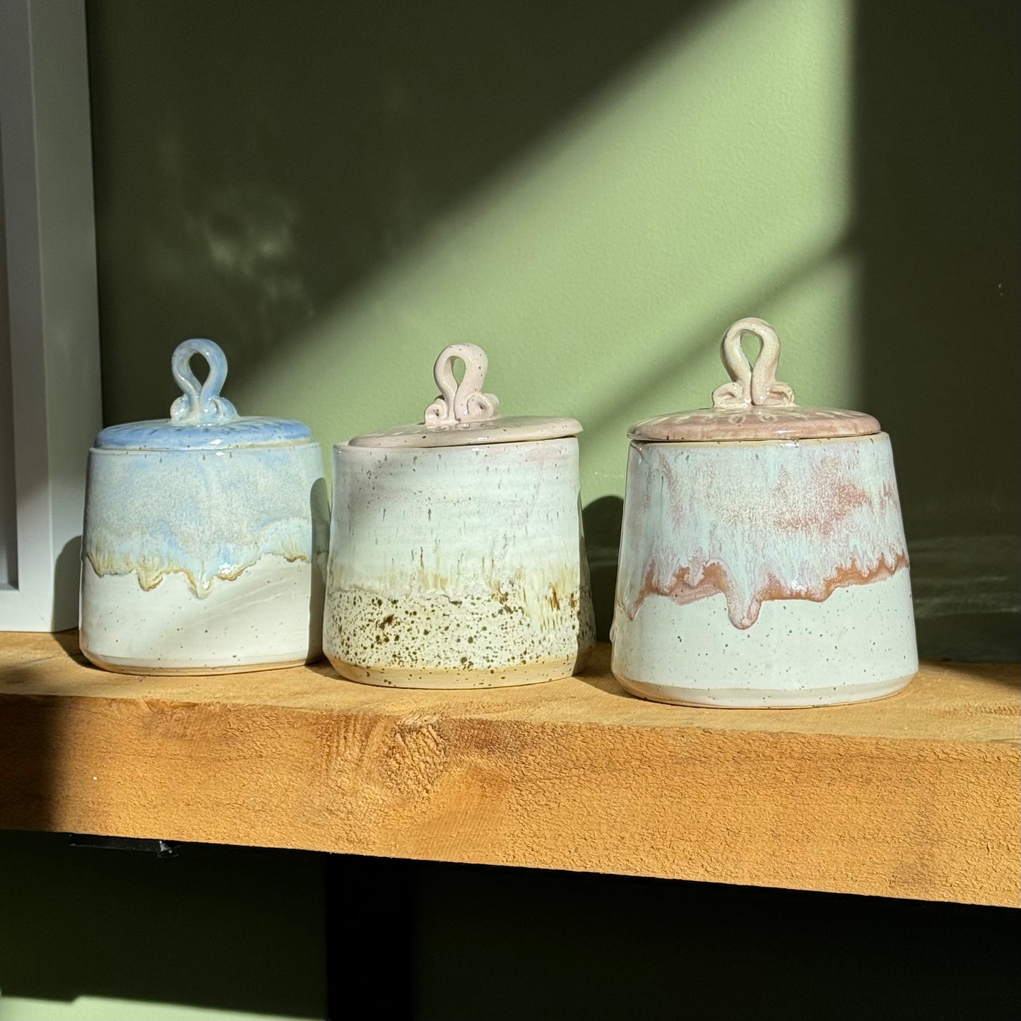 Lovely one of a kind canisters in three different glazes.