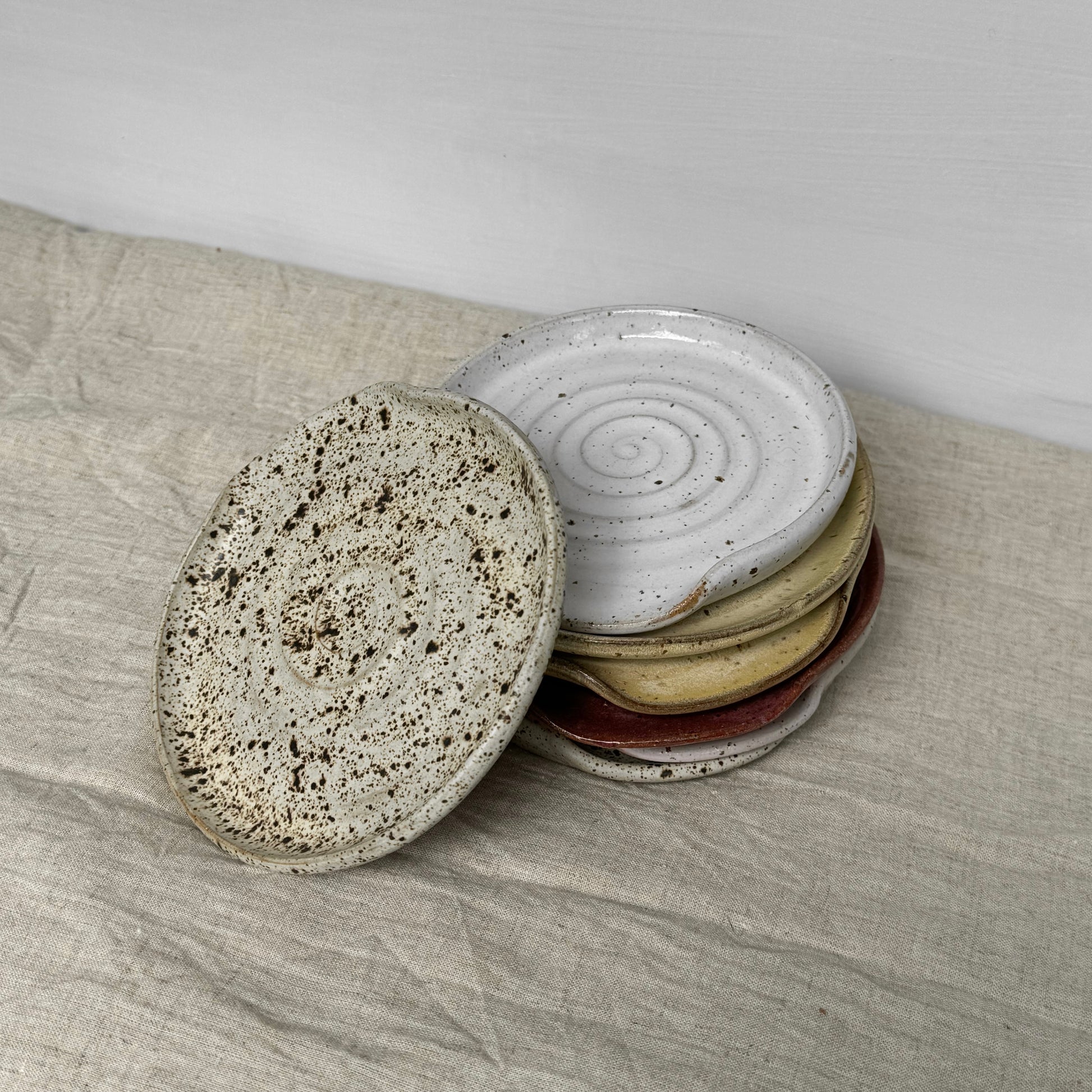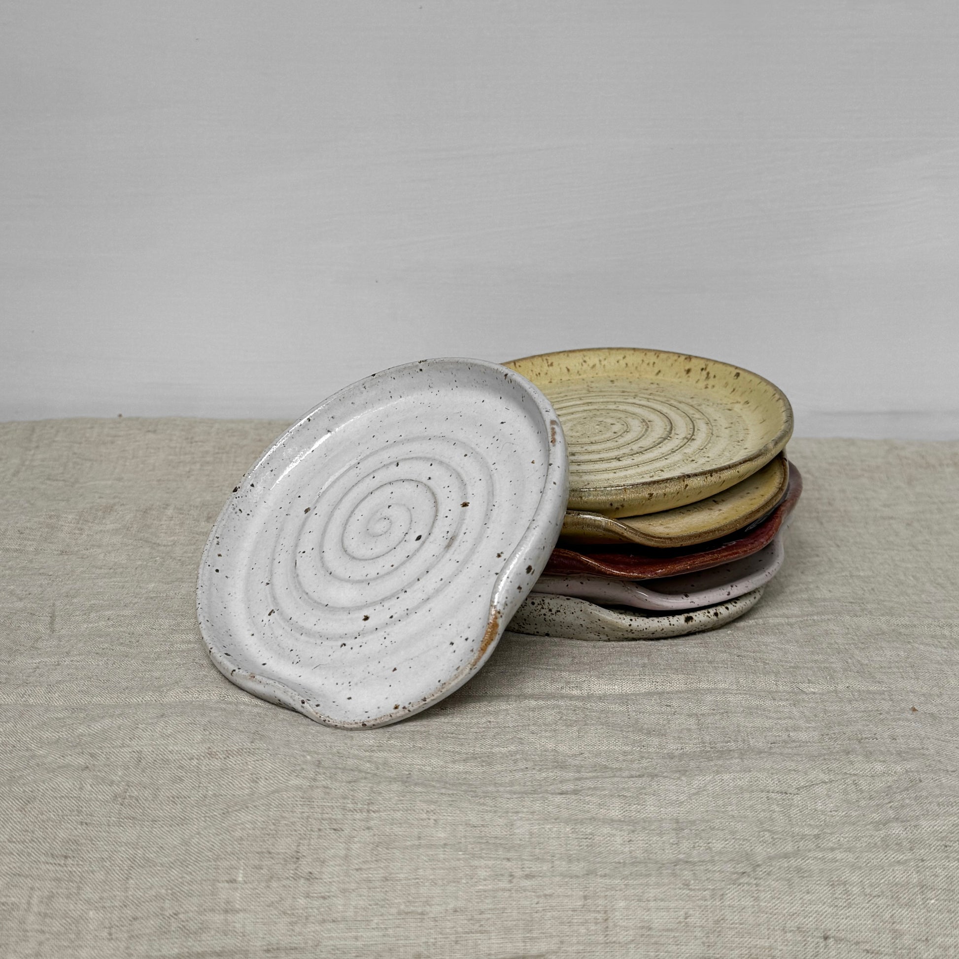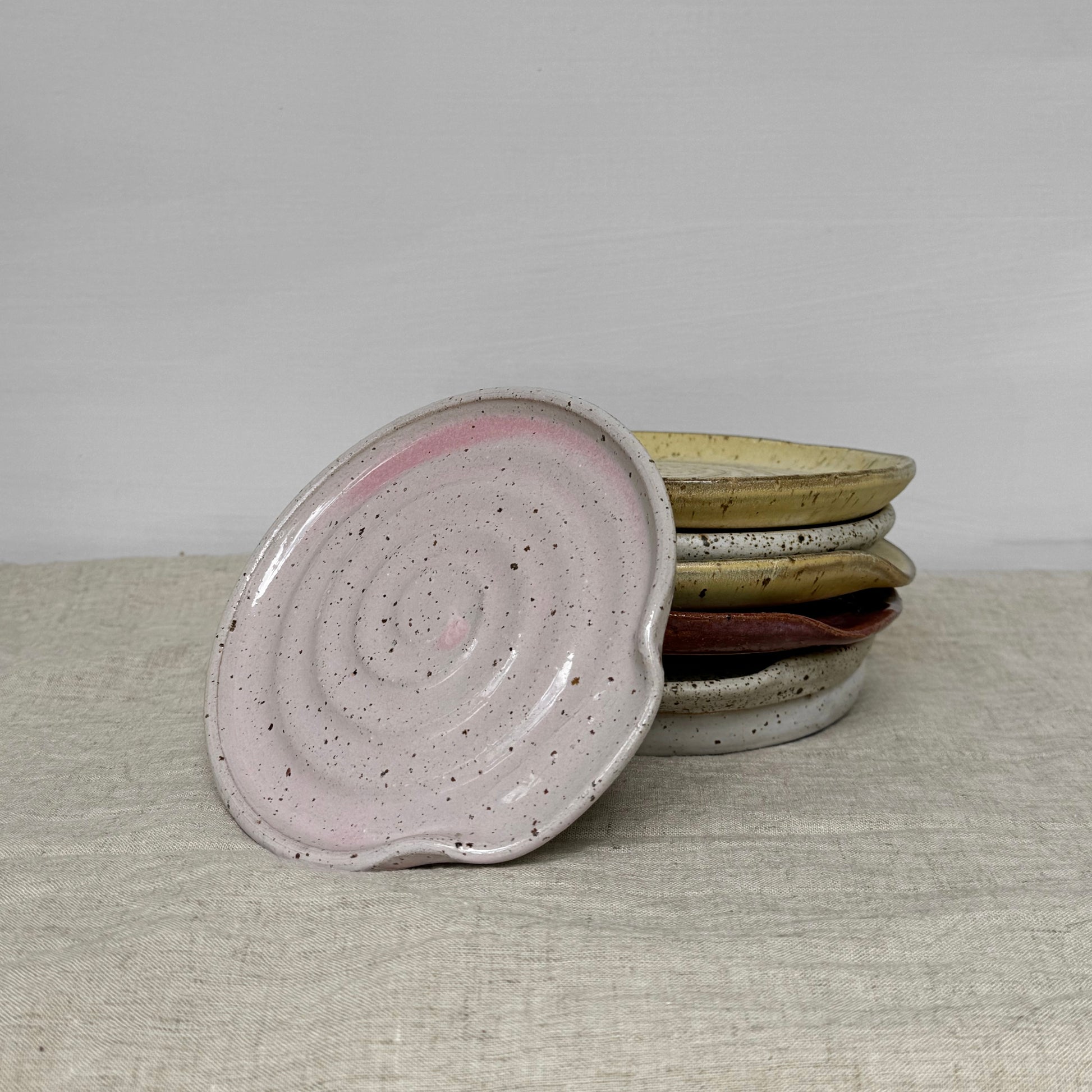 Lovely spoon/utensil rests. Made from speckle buff clay, in an assortment of colours.